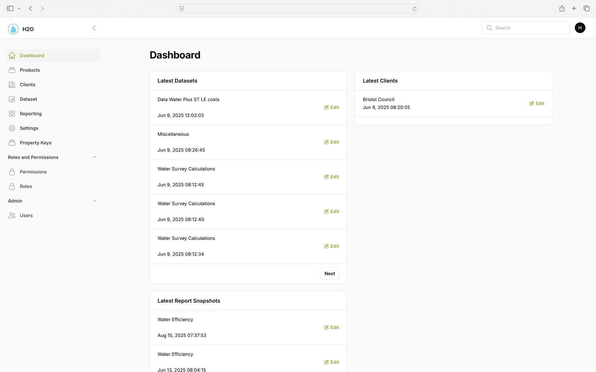To streamline operations and lay the groundwork for a future commercial offering, H2OiQ needed a platform that could automate the reporting process, structure their data, and provide better visibility across client engagements. This meant importing data from existing systems, managing complex cascading calculations, and generating custom, professional-grade PDF reports, all from a unified, intelligent backend.